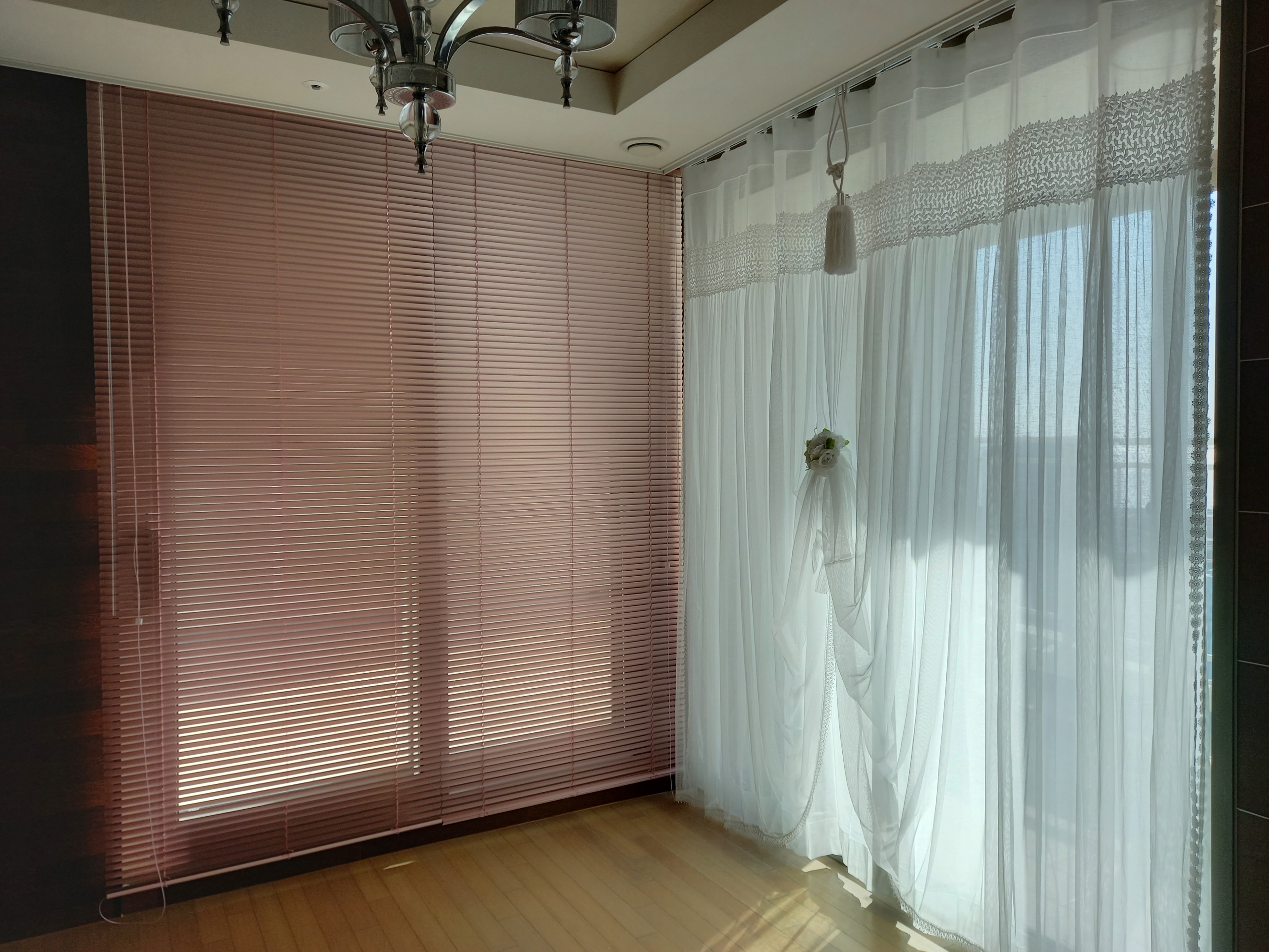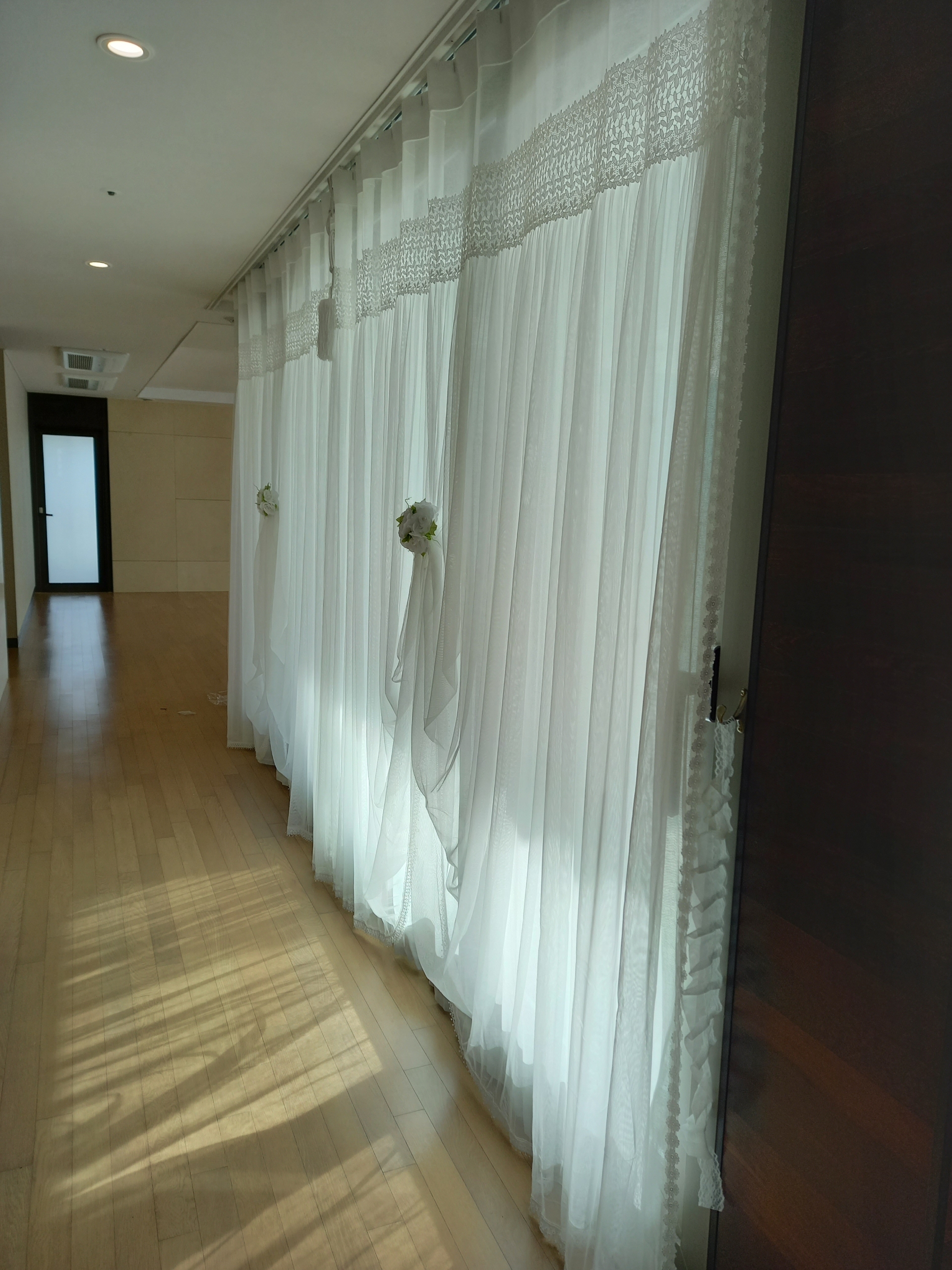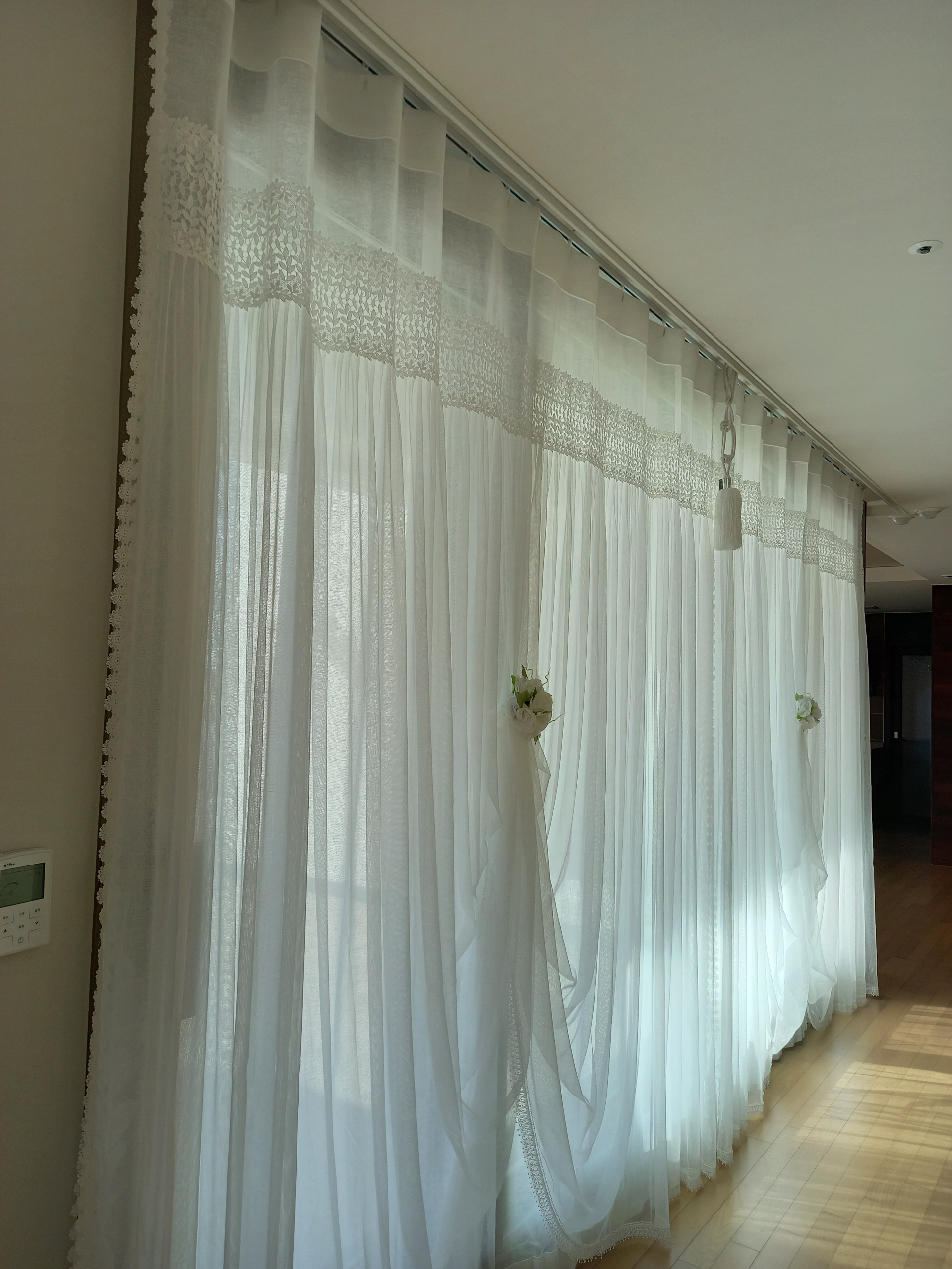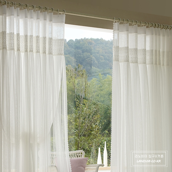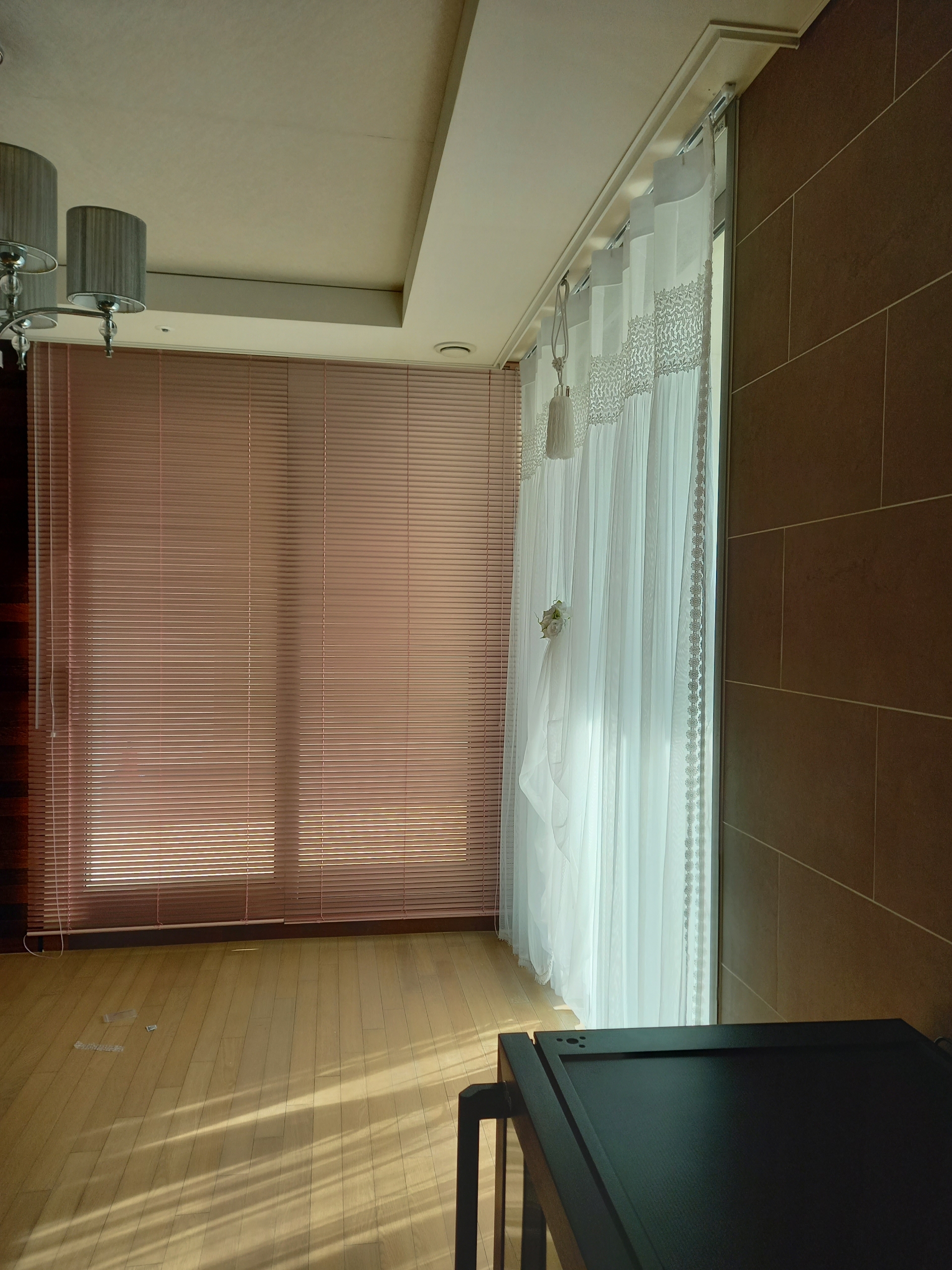 거실 테라스는 레이스 커튼과 베이지컬러 버티컬로 시공하셨습니다