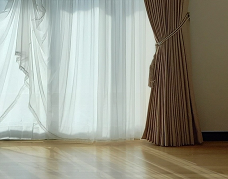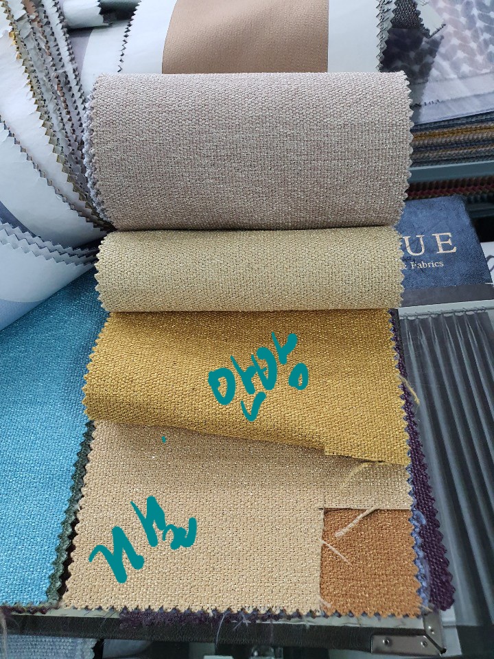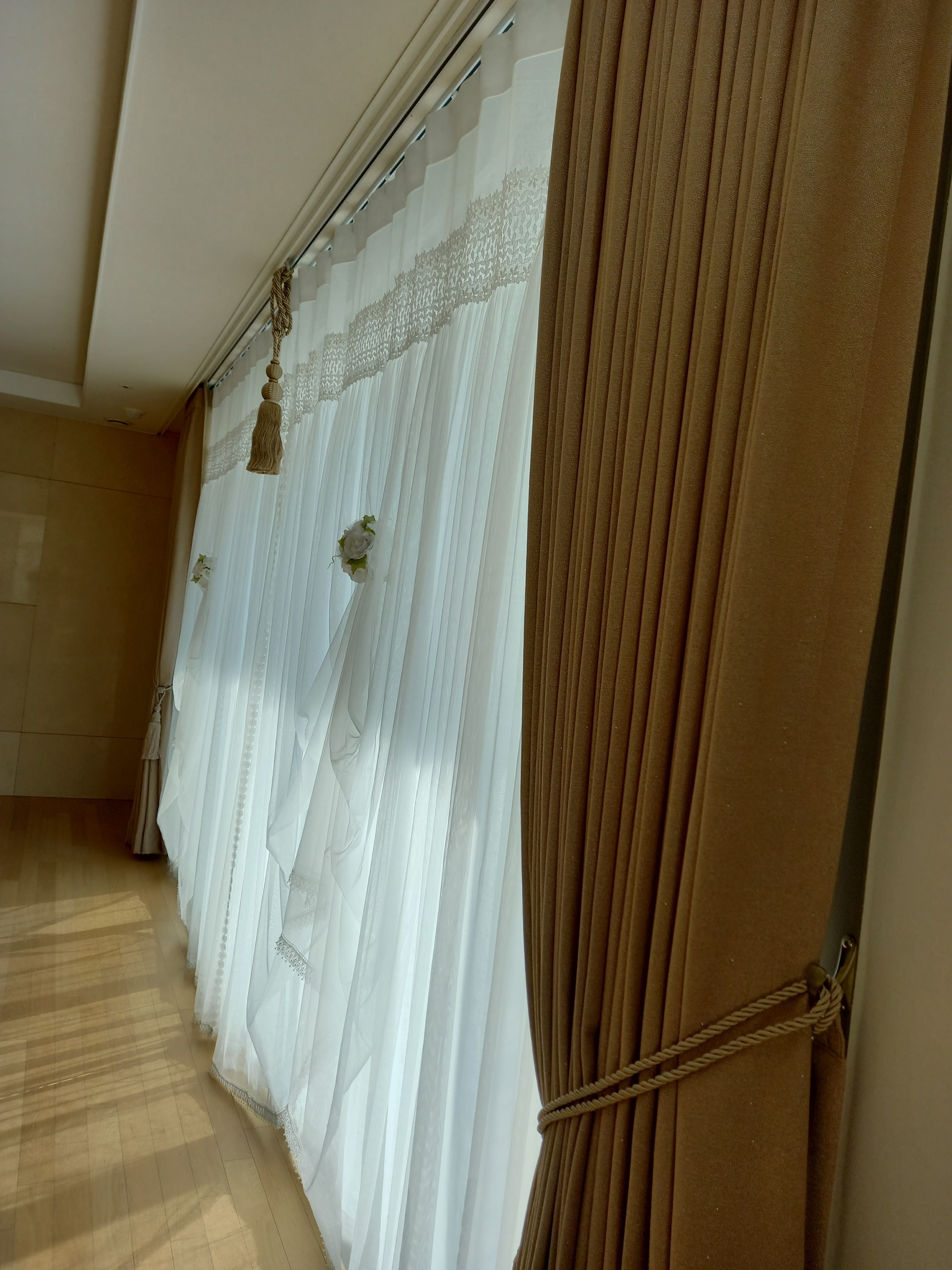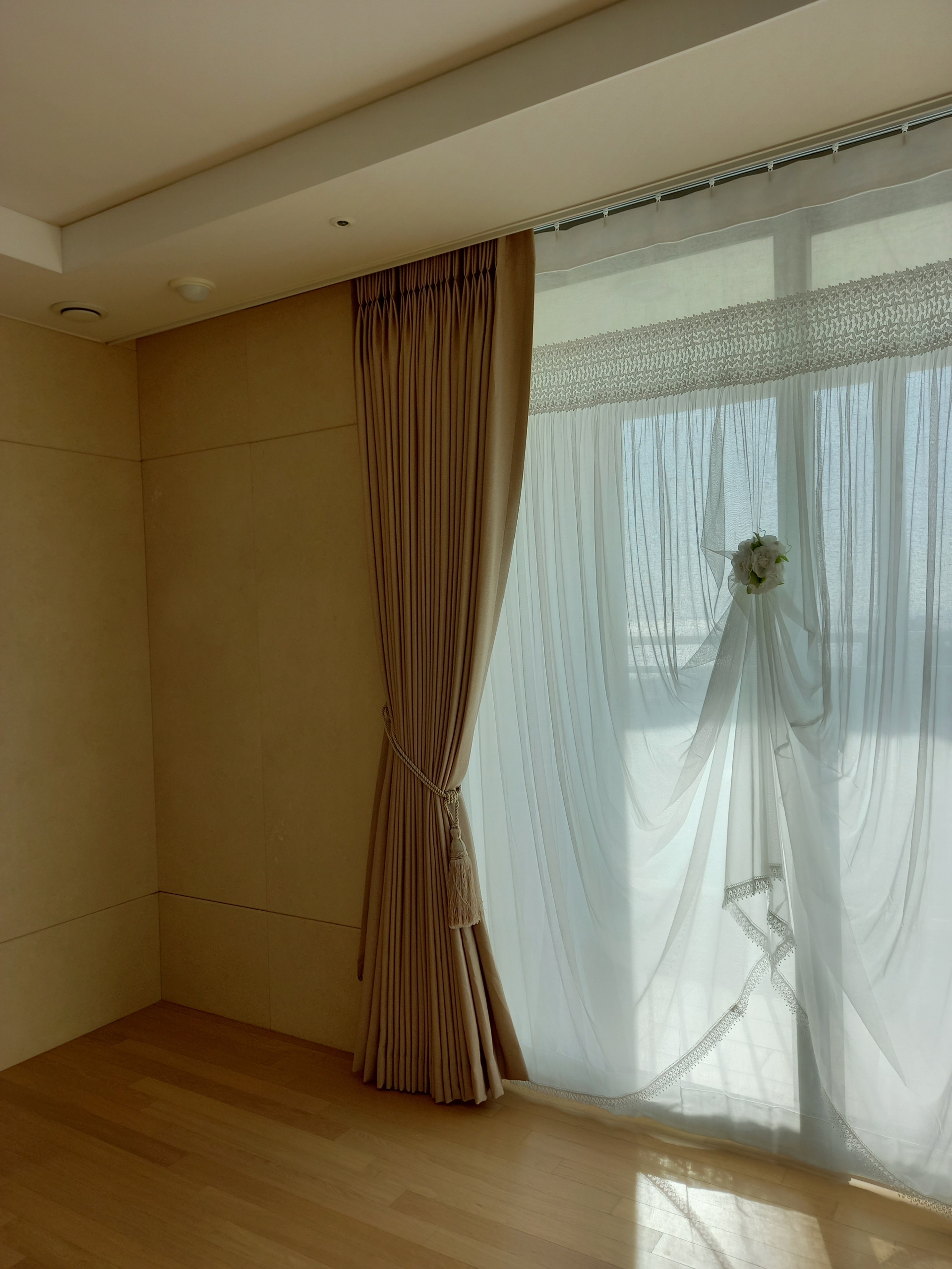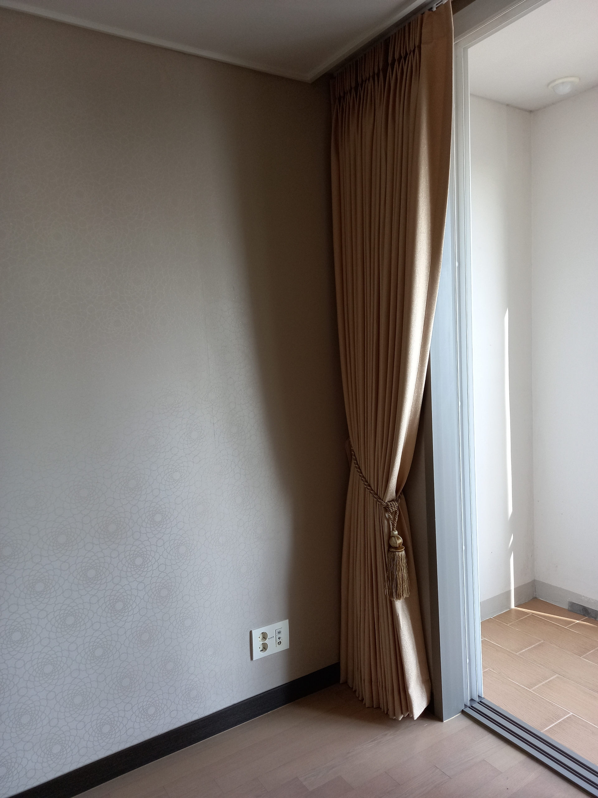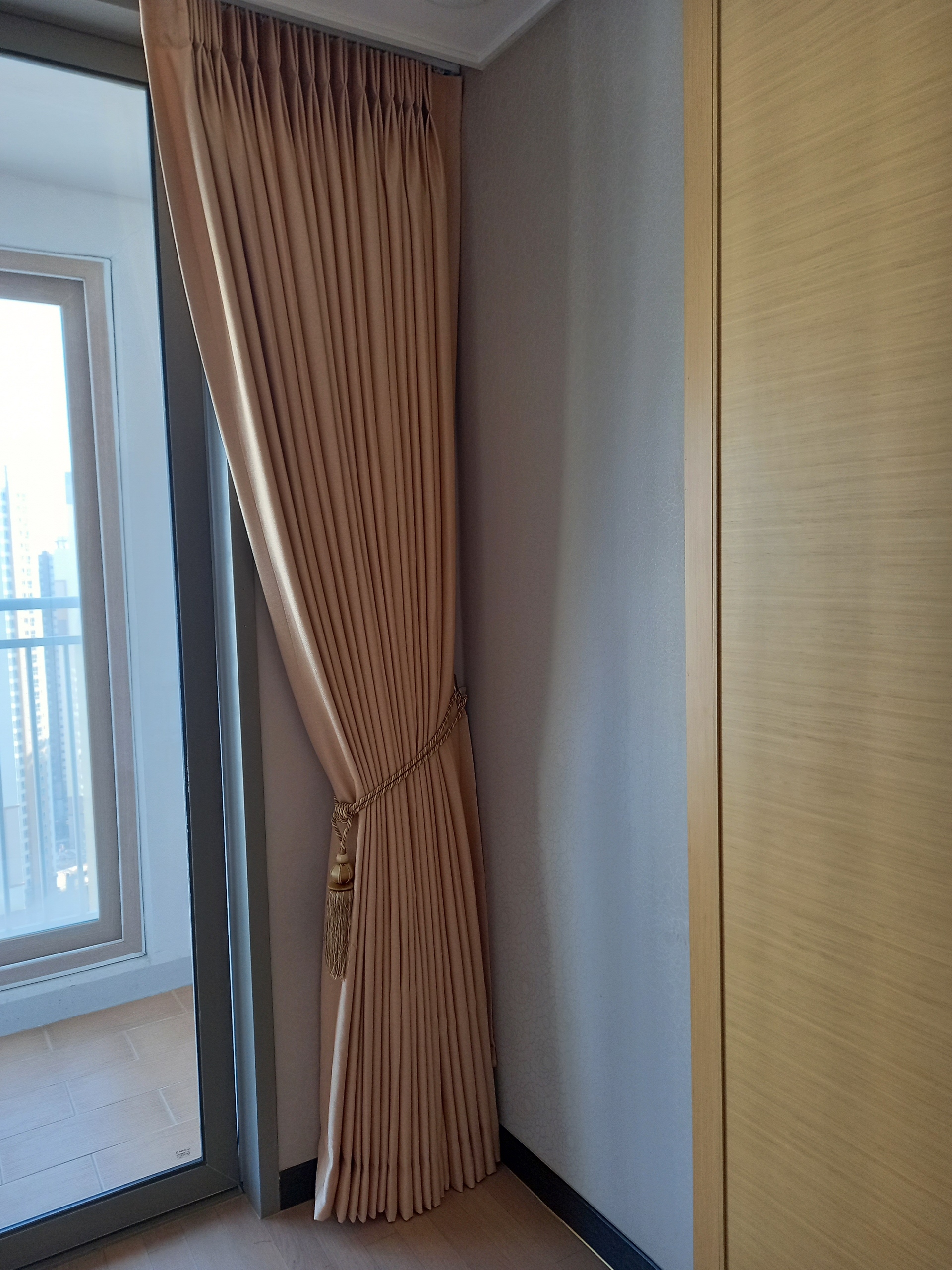 안방은 골드톤의 암막 원단으로 설치하였습니다